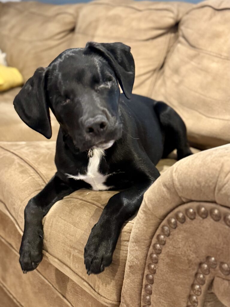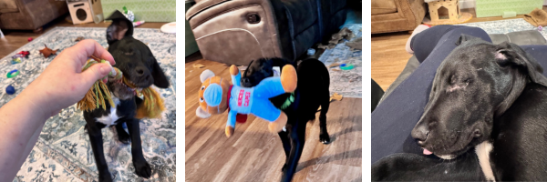 Ribbet’s journey has been nothing short of inspiring. After suffering life-threatening injuries that required emergency surgery to remove both eyes, he has made a stunning recovery in the loving care of his foster family, who has now become his forever family. His new family has been teaching him how to play fetch with a jingle ball.