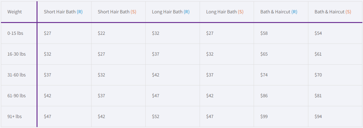 Weight Short Hair Bath (R) Short Hair Bath (S) Long Hair Bath (R) Long Hair Bath (S) Bath & Haircut (R) Bath & Haircut (S)