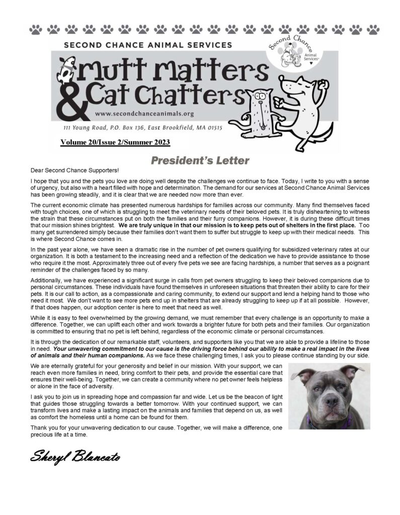 Dive in to our Summer Newsletter August 9, 2023/ Posted By : animal/ 0 comments / Under : Adopt, News, Vet Services It may be hot outside, but the latest edition of Mutt Matters and Cat Chatters is filled with heartwarming stories that will warm your heart even more. CLICK BELOW TO START READING