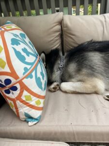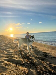 He’s smart and sweet. The real secret for Blue was the same as every husky, daily exercise. Our beach walk keeps him very satisfied for the rest of the day. My husband passed from cancer in March and my two 13-year-old huskies passed within the last year, so frankly Blue has done more for me than I for him.”