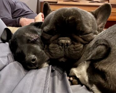 We are happy to report that Ribbet continues to make progress. Despite all he’s been through, he’s finding great comfort being in the company of the other dogs in his foster’s home. These older dogs have been so loving and super gentle with him. Here they are cuddling together.