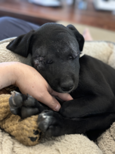 Ribbet’s journey has been nothing short of inspiring. After suffering life-threatening injuries that required emergency surgery to remove both eyes, he has made a stunning recovery in the loving care of his foster family, who has now become his forever family. His new family has been teaching him how to play fetch with a jingle ball.