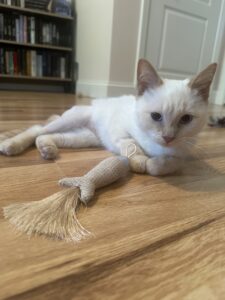 “She has already settled in and is doing so well! Eating, using the litter box, playing. Her hip doesn’t seem to impact her spirit which is so great to see. She is a HUGE cuddlebug and hasn’t stopped purring since we brought her home. We feel so grateful to have her in our lives.”
