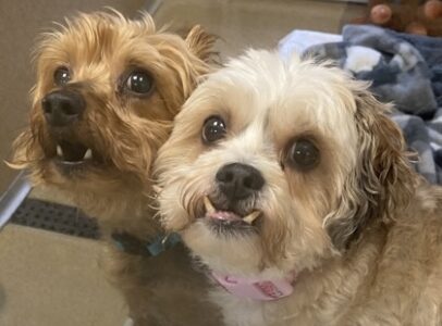 Maltese Toy Poodle Iko and Yorkshire Terrier mix Ollie, ages nine and eight, share a bond that is immediately clear. These two find comfort and confidence in one another and must be adopted together. Their connection brings out the best in both of them, and watching them interact is a joy. They do have minor medical considerations, and our team is happy to discuss details to ensure the right match.