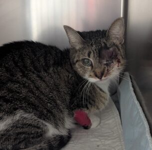 At just two-years-old, Toast had been through a lot in her young life. This sweet cat was surrendered to us on New Year’s Eve and was found to have a mass on her upper eyelid. Surgery was planned, but we soon discovered she was pregnant. Toast went into foster care to safely have her kitten, and once her baby was weaned, she was finally ready for the procedure.