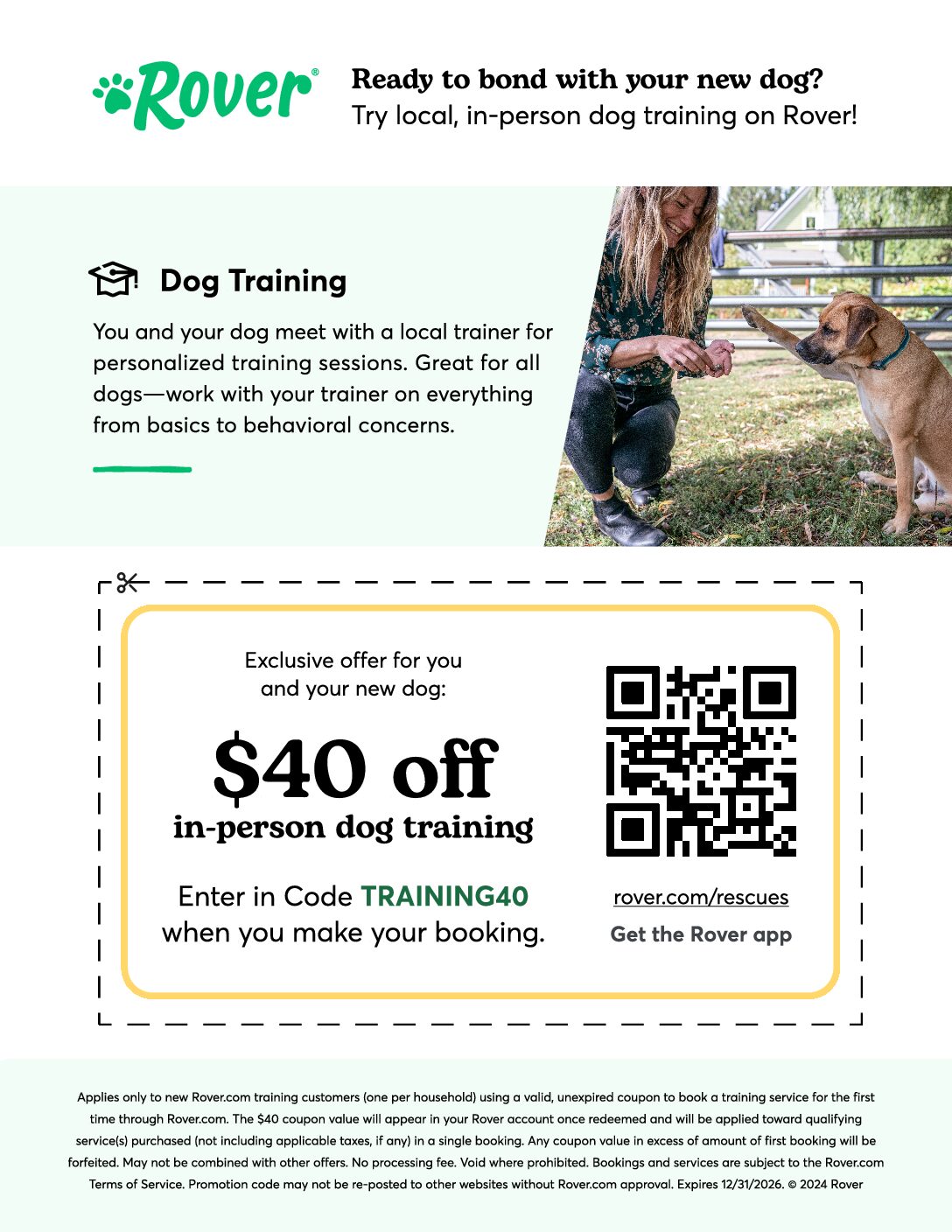 Rover is offering $40 off in-person dog training for new customers to create a training program for your dog’s unique needs and prevent surrenders.